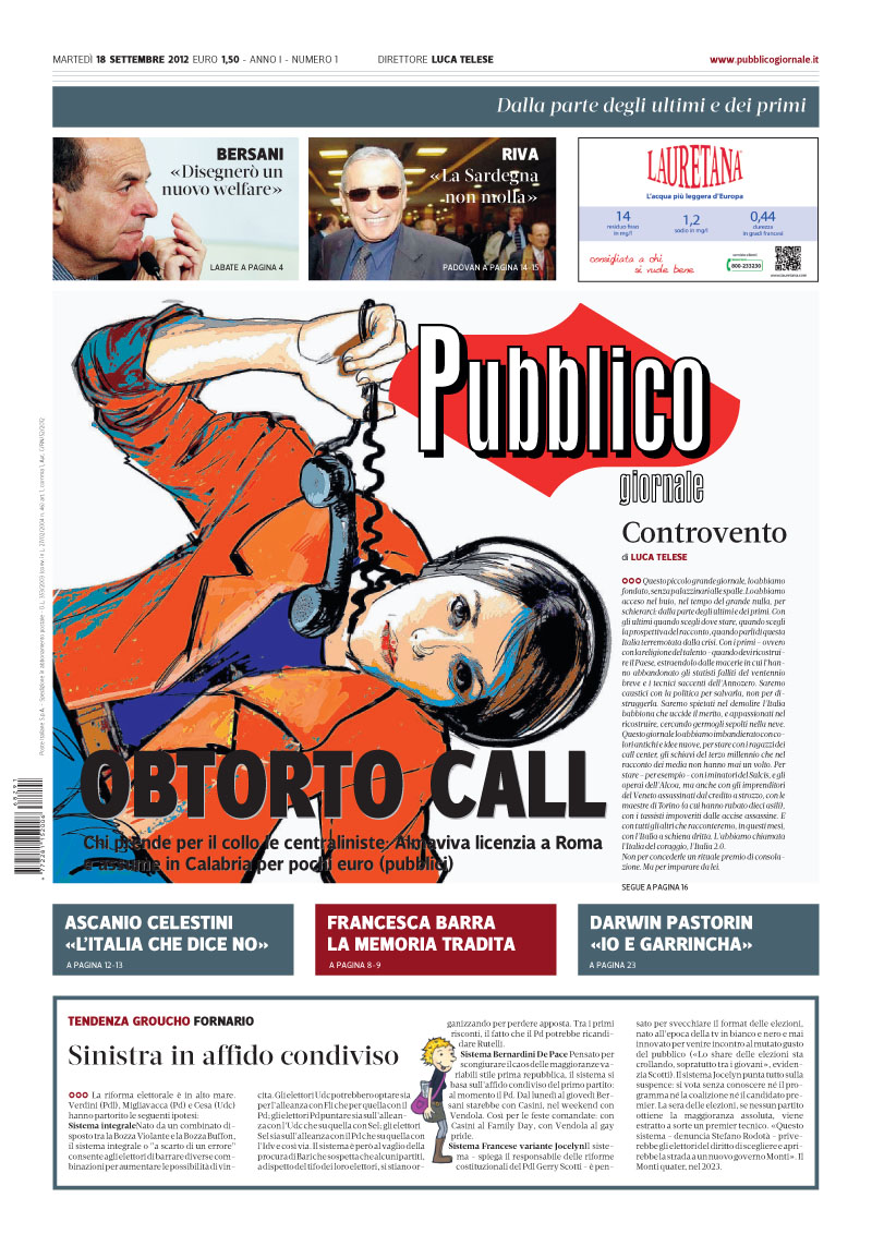 Los que nos sigan por twitter (@maquetadores) sabrán ya muchas de las cosas que les contamos en este post. Por ejemplo que, como intuíamos ayer, el logo de Pubblico es un homenaje que el director, Luca Talese, quiere rendir al gran diario francés Libération. Pero aparte de este guiño, en la web del estudio que ha hecho el diseño (albertovaleri.com) nos cuentan los principios que han regido la elaboración del prototipo final.